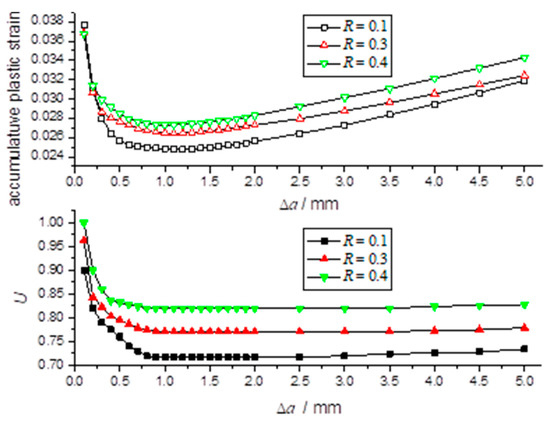 Figure 13 shows the effect of the stress ratio on accumulative plastic strain and crack closure parameters. It can be observed that when the stress ratios are 0.1, 0.3, and 0.4, the corresponding crack closure parameters at steady state are 0.717, 0.771, and 0.82, respectively. The corresponding range of decrease in accumulative plastic strain is 1.29%, 1.04%, and 0.95%, respectively. It is evident that a smaller stress ratio results in a smaller crack closure parameter, as well as a greater reduction in the range of accumulative plastic strain. The data suggest that an increase in the crack closure effect can lead to a decrease in accumulative plastic strain, with both factors tending to stabilize at a later stage. Additionally, the length of the crack has an influence on its propagation behavior. During the final stages of crack propagation, an increase in accumulative plastic strain may hinder the crack closure effect, causing the crack closure parameter to gradually increase. This trend is primarily due to a decline in the residual compressive stress field behind the crack tip.