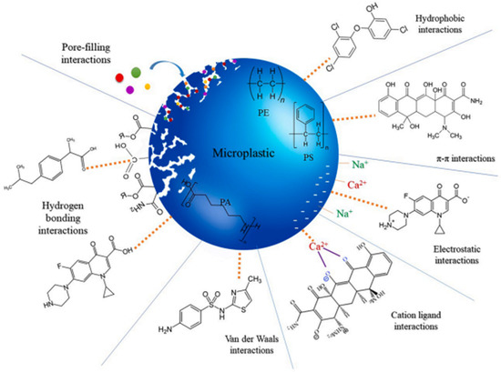 Atugoda et al. [17] summarized that PH sorption onto MPs relies on six types of interaction: hydrophobic, electrostatic, H-bonding, van der Waals force, pore filling, and π–π, Figure 1. The hydrophobic interaction occurs if both the PHs and polymers are hydrophobic with a high log Kow, a value > 4, which is less attracted by water molecules [45,53]. However, most PHs present hydrophilic and polar groups in their structure, which indicates mechanisms other than hydrophobic ones. If they are hydrophilic and of non-aromatic/aliphatic origin, as most of them are, electrostatic and van der Waals attraction forces occur [54]. The π–π interaction comes into play in the interaction between aromatic MPs and PHs [55]. Hydrogen bonding is less common and occurs between a very electronegative atom and a hydrogen atom covalently bonded to a very electronegative atom, N, O, or F atom [35]. For instance, ciprofloxacin, amoxicillin, tetracycline, sulfamethoxazole, and steroidal hormones bind to PA microplastics through hydrogen bonding [56]. Electrostatic interactions, hydrogen bonds, and van der Waals are weaker than covalent and ionic bonds [57] and are dominant in MPs–PHs interaction [58]. Table 1 summarizes recent findings on the mechanisms of interaction of MPs with PHs. Generally, PE, polystyrene PS, polypropylene PP, and PVC MPs are the most studied polymers for which two main adsorption mechanisms are reported: hydrophobic and electrostatic interactions.