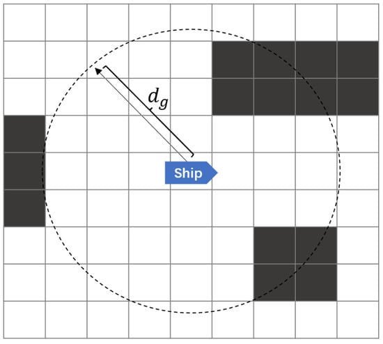 where denotes the risk from obstacles, and denotes the stranding risk from shallow water area. The purpose of designing the model is to maintain a certain safe distance from obstacles in the environment and prevent collisions between the ship and obstacles caused by wind, water currents, and other factors. The purpose of designing the model is to ensure that the ship can avoid grounding or potentially grounding areas. The expression for is as follows: