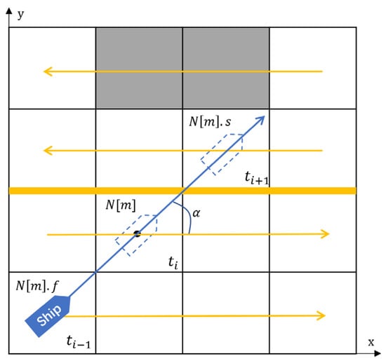 where is the ship velocity, and represents the angle between the water current and the horizontal direction. As shown in Figure 2, is the angle between vector and the horizontal direction, while represents the angle formed between the current position of the ship N[m] and the obstacle O[n].