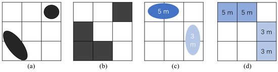 To accurately represent the path-planning process, it is necessary to create a two-dimensional environment map. There are several conventional methods for environmental modeling, including the grid, geometric information, and view methods [48]. The grid method involves dividing a planar map into a series of grids to create a grid map. This method is efficient in representing the characteristics of the actual environment while optimizing time and space consumption. It is also simple and direct, reducing the path search time and simplifying programming. Therefore, the grid method is utilized in this study to model the navigation environment.