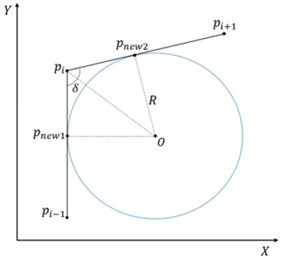 From the slope and the point , the vertical straight line and the straight line passing through the point can be obtained. In the same way, can be obtained ( passes through and is perpendicular to ). The intersection of the straight lines and is the center of the circle, and the center of the circle is set to ; then, the function expression of the curve after smooth geometric optimization is as follows: