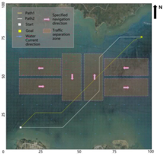 For this study, we conducted simulation experiments on the Python 3.8 platform and used a 50 × 40 grid map for the experiment. In order to simulate realistic environmental conditions, we created a complex environment that included current velocity, shallow water areas, and traffic separation zones.