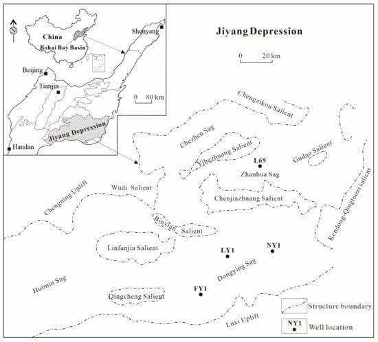 Jiyang Depression is part of the first-order tectonic unit of the Bohai Bay Basin in East China, which is located west of the Tan-lu fault zone, south of the Chengning uplift and north of the Luxi uplift (Figure 1). The depression is 240 km long and 130 km at its widest point and covers about 26,000 km2. Jiyang Depression, a typical structure with sags and uplifts, is a Mesozoic–Cenozoic rift–depression composite basin composed of four negative secondary tectonic units, including Dongying, Huimin, Zhanhua, and Chezhen Sags as well as several positive secondary tectonic units including the Gudao, Yihezhuang, Chenjiazhuang, Wudi, Binxian, and Kendong Qingtuozi uplifts (Figure 1). Dongying and Zhanhua Sags are the richest hydrocarbon accumulation areas in the Jiyang Depression, from which about 30 shale oil wells have obtained good oil production. For example, Y183 well produced more than 11,138.8 t of shale oil from November 2013 to the present.