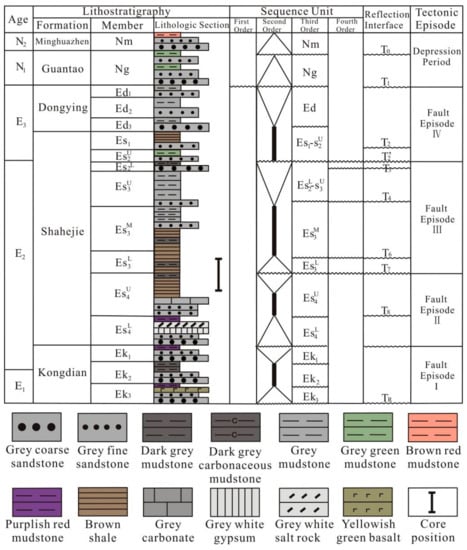 Sequence stratigraphic column for the Dongying Sag (the data was from [,,,]).