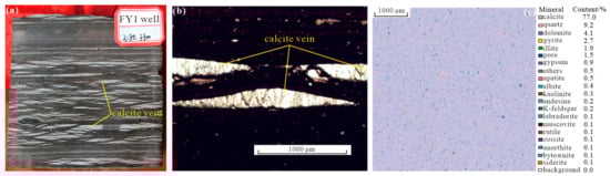 Petrological characteristics of oil shale. (a) Parallel calcite veins in core; FY1 well, 3180.33 m. (b) Parallel calcite veins under a polarizing microscope, 50×(−); FY1 well, 3181.88 m. (c) Calcite (the main mineral) and quartz (second most abundant mineral) in the 2D whole-mineral scan by FE-SEM; L69 well, 3027.30 m.
