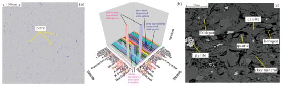 Lacustrine shale is commonly rich in type I kerogen, which makes it an excellent source rock [,,]. Shales are characterized by abundant organic matter with nano-scale pores and pore throats. Shale oil consists of hydrocarbons that exist in pores in free, adsorbed, and dissolved states. Furthermore, like all fine-grained rocks, lacustrine shales have good sealing capacities for oil and gas []. In order to characterize the pore structure of shales, a series of advanced technologies has been introduced based on microscopy, including high-resolution field emission scanning electron microscopy (FE-SEM), atomic force microscopy (AFM), small-angle and ultra-small-angle neutron scattering (SANS and USANS, respectively), and transmission electron microscopy (TEM) [,,,,,]. For three-dimensional non-destructive observation of shale pores, X-ray microscopy and computed tomography (CT), nano-CT, and focused ion beam (FIB)-SEM have been used [,]. In addition, the 3D distribution of the various rock components and pores can be obtained by a digital core technique that combines energy dispersive spectroscopy (EDS) with backscattered electron imaging (BEI) [,,]. These technologies have shown that the pore structure of lacustrine shale reservoir rock consists of multi-scale pore throats and fractures [].