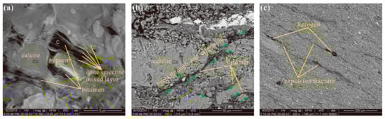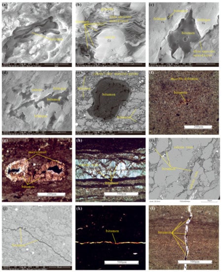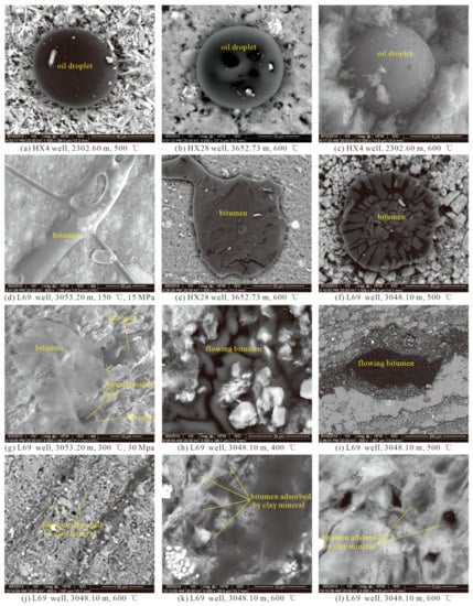 The occurrence of oil and gas in shale reservoirs has been investigated by many groups [,]. The three states for bitumen include free, adsorbed and dissolved states []. In this study, we utilized ESEM to observe the original shale samples and post-thermal simulation samples and determined that the bitumen occurs mainly in the free state (Figure 7a–i), followed by the adsorbed state (Figure 7j–l). These results are in agreement with those of O’Brien et al. (2002) [], who also conducted a thermal simulation experiment on organic-rich shale. The bitumen in the free state is distributed mainly in the organic pores, large-scale intercrystalline (intergranular) pores, hydrocarbon expulsion fractures, bedding-parallel vein fractures, bedding fractures and structural fractures, and shows obvious flow traces (Figure 7g–i). The adsorbed bitumen is distributed mainly in the intracrystalline pores of the clay mineral (Figure 7j–l).