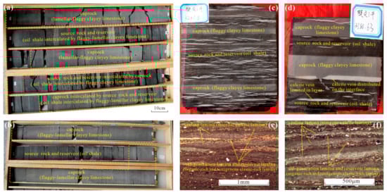 Different lithofacies in shale have varying mechanical strengths and physical properties due to differences in the composition of both inorganic minerals and organic matter []. The carbonate-rich lithofacies have high mechanical strength, poor physical properties such as low permeability and good sealing ability, whereas low maturity clay-rich or organic-rich lithofacies have weak mechanical strength and can easily be fractured by overpressure fluid []. The evolution of the continental lacustrine sedimentary environment in the study area caused the carbonate-rich lithofacies and the clay-rich or organic-rich facies to develop alternately, which formed sets of sandwich-type strata at different scales (Figure 6): Interbedded clayey limestone and oil shale form alternating source rock, reservoir, and caprock (Figure 6a), and clayey limestone acts as caprock, and oil shale acts as source rock and reservoir (Figure 6b), and the calcite veins are limited in the oil shale layer or are distributed on the interface between oil shale and clayey limestone (Figure 6c,d); micritic calcite laminae acts as sealing laminae alternating with organic-rich and terrigenous clastic-rich laminae as oil-generation and reservoir laminae under a polarizing microscope, i.e., sealing laminae alternating with oil-generation and reservoir laminae forms a small-scale source–reservoir–caprock assemblage (Figure 6e,f). The typical pattern has two sets of clayey limestone strata as the roof and the floor with oil shale in the middle (Figure 6a,b). The caprock roof has good mechanical strength and poor physical properties, and oil shale with porosity as the source and reservoir. This type of arrangement can easily form a closed system in which bitumen is continuously generated and accumulated to create pore fluid overpressure []. In addition, the calcite veins are limited in the oil shale layer or are distributed on the interface between oil shale and clayey limestone, and are almost absent in the clayey limestone, which means that the clayey limestone (the caprock) is dense enough for fluid to flow. It serves as strong evidence for the sealing ability (Figure 6c,d). Moreover, the sandwich-type strata structure composed of strong and weak lithofacies resists strong external tectonic stress and has self-regulation against deformation to preserve overpressure liquid for long periods, which could help to preserve the shale oil and gas. The production sections of the upper fourth member and the lower third member of the Shahejie Formation in Zhanhua Sag have both a roof and floor. Therefore, the sandwich-type structure of a shale oil reservoir determines its self-sealing ability.
