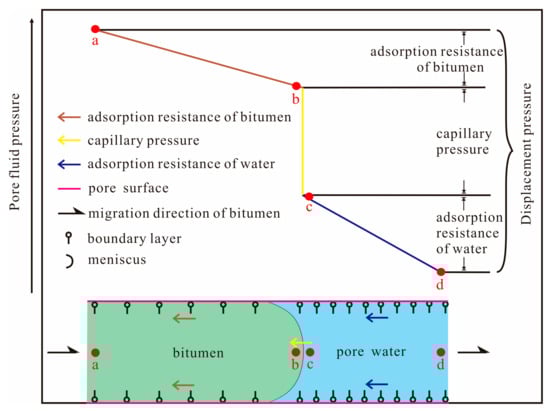 Bitumen is displaced from kerogen into nearby reservoir space and migrates in a horizontal direction, which displaces pore water in an oil–water two-phase flow process. Owing to the original hydrophilic conditions of the inorganic mineral surfaces in the shale, capillary pressure creates resistance to water displacement. Felsic and carbonate minerals in shale are extremely small, mainly at the fine-silt scale. However, clay minerals and organic matter are abundant and have large specific surface areas and high adsorption capacities. The shale develops a micro–nano-scale pore and throat network in which the throat is composed of intracrystalline pores of clay mineral or intergranular pores between clay mineral clusters and clastic grains. The fluid in the pores and throats of shale is affected by adsorption resistance owing to a large pore curvature, weak connectivity, high irreducible water saturation and poor physical properties [,,]. Therefore, the migration of bitumen displacing water overcomes the capillary pressure and adsorption resistance. We thus define the displacement pressure of shale as the sum of capillary pressure and adsorption resistance (Figure 8). According to the equilibrium relationship between the dynamic force and resistance, the fluid pressure of bitumen is the main driving force of the migration, although buoyancy should also be considered for the vertical migration of the bitumen.