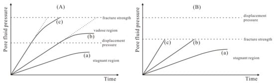 The main mechanism of pore fluid pressurization is hydrocarbon generation. Fluid displacement is hampered by extremely small pore throats and low permeability. Hence, the volume and, to a greater extent, the rate of hydrocarbon generation are important factors in the buildup of pore fluid pressure []. Generally, a rock’s fracture strength is larger than its fluid displacement pressure. At low hydrocarbon generation rates, the generated hydrocarbon volume is insufficient to generate a pore fluid pressure that reaches the rock’s fracture strength, and the hydrocarbon will be retained in the pore (Figure 9(Aa,Ba) and Figure 10a). If the hydrocarbon generation rate is moderate and the pore fluid pressure is larger than the displacement pressure but smaller than the rock’s fracture strength, the hydrocarbon will break through into the adjacent pores according to the migration model of subcritical flow until reaching a balance between hydrocarbon generation and seepage (Figure 9(Ab) and Figure 10b). However, if the hydrocarbon generation rate is high and its quantity is larger than the seepage discharge, hydrocarbons will accumulate and the pore fluid pressure will increase continuously until overcoming the displacement pressure as well as the rock’s fracture strength to generate hydrocarbon expulsion fractures; then, the fluid will migrate in the model of instantaneous flow (Figure 9(Ac) and Figure 10c) [,,]. In particular, when the shale has a high content of organic matter, abundant laminae develop and the rock matrix is very dense but brittle. In this case, the rock’s fracture strength is smaller than the displacement pressure and the pore fluid pressure quickly reaches the rock’s fracture strength. Then, hydrocarbon expulsion fractures easily form, which enables the migration of instantaneous flow (Figure 9(Bb,Bc) and Figure 10c).