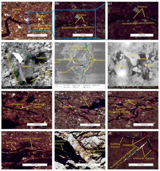 The results of shale reservoir pore structure indicate multi-scale properties and a gradually connected network. The large-scale reservoir space is connected with the small-scale one, which determines the multi-scale migration of bitumen and eventually the accumulation in the large-scale reservoir space. The bitumen migrates away from the source kerogen, breaks through into nearby intercrystalline (intergranular) pores and then continues to migrate outside (Figure 11a–c), as indicated by optical microscopy. This phenomenon is observed more clearly under FE-SEM, where free-state bitumen migrates from kerogen organic pores (Figure 11d), enters nearby nano–micro-scale intercrystalline (intergranular) pores with the flow sign (Figure 11e), and accumulates in the micro-scale intergranular dissolved pores (Figure 11f). Especially in organic-rich shale, kerogen gradually accumulates to form an organic-matter network under pressure (Figure 11g–j) [,] and is usually connected by hydrocarbon expulsion fractures (Figure 11h–j). Bitumen migrates from the organic-matter network and hydrocarbon expulsion fractures (Figure 11g–k) and eventually accumulates into the larger scale bedding-parallel vein fractures, bedding fractures or structural fractures (Figure 11k,l).