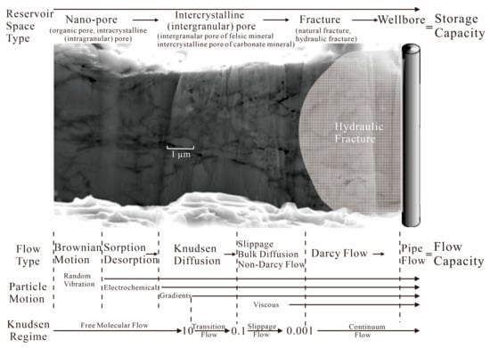 The study of shale gas indicates that the diversity and multiple scales of the reservoir space determine the occurrence, flow pattern and flow mechanism [,,]. The organic pores and intracrystalline (intragranular) pores are mainly at the nanoscale, in which natural gas is in the dissolved and adsorbed states, and the flow type includes Brownian motion, desorption and Knudsen diffusion. The intercrystalline (intergranular) pores are at the micro-scale, in which natural gas is in the adsorbed and free states, and the flow type includes Knudsen diffusion, slippage, bulk diffusion and non-Darcy flow. The scale of natural fractures and hydraulic fractures is larger than that of pores, in which the occurrence of natural gas is in the free state and the flow types are mainly Darcy flow and pipe flow (Figure 12).