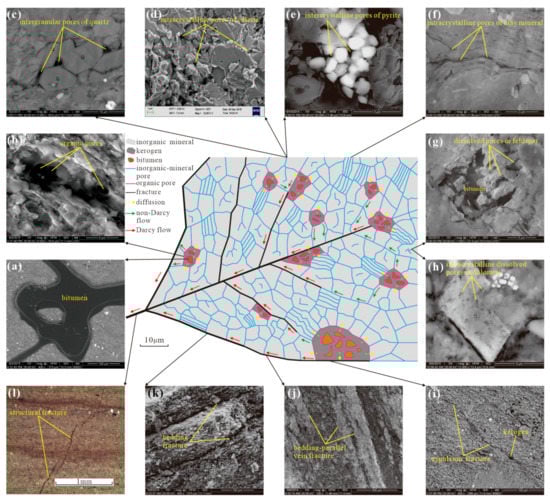 Similar to the seepage characteristics of shale gas, shale oil of the upper fourth member and the lower third member of the Shahejie Formation also has modes of multi-scale migration and accumulation (Figure 13). For shale in the oil-generation window, the pyrolysis of kerogen generates bitumen under high temperatures and pressures (Figure 13a), which exists in organic pores in the free state or the dissolved state (Figure 13b). The pore fluid pressure generated by hydrocarbon generation drives bitumen in the free state to migrate into the boundary pores of organic matter and intercrystalline (intergranular) pores mainly according to the migration model of subcritical flow or into hydrocarbon expulsion fractures according to the migration model of instantaneous flow. Secondly, it migrates into nearby reservoir space from the inside of the kerogen by diffusion and is then absorbed on the surfaces of kerogen or inorganic minerals. The bitumen in the free state overcomes the displacement pressure (the sum of capillary pressure and adsorption resistance) as a result of the pore fluid pressure and migrates into the intercrystalline pores by the non-Darcy flow. Intercrystalline pores are found in quartz, calcite and pyrite, clay, feldspar and dolomite (Figure 13c–h). Alternatively, it accumulates in hydrocarbon expulsion fractures by Darcy flow (Figure 13i). The bitumen gradually migrates into the larger-scale intercrystalline pores or fractures and eventually accumulates in bedding and structural fractures (Figure 13j–l); then, it follows the vein-type model of the multi-scale progressive transport network (Figure 13). The displacement pressure of the bitumen shows anisotropy owing to the heterogeneity of the shale fabric. The bitumen always migrates along the path of minimum resistance driven by pore fluid pressure. Although not all of the reservoir space is filled with oil in the pore network, a dominant migration pathway is present with the optimal transport structure obeying Murray’s law []. That is, at least one pore and throat network at a certain scale forms the most connected pathway. This indicates that the minimum resistance needs to be overcome during the migration and accumulation of bitumen in the optimal pathway, which is key for high-efficiency fluid seepage.