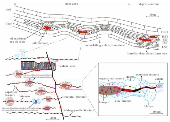 Different lithofacies within the studied sections have different potentials for oil generation, reservoir and sealing, and play different roles in the source–reservoir–caprock unit. Lithofacies in the early–middle diagenesis stage are determined mainly by the sedimentary environment; therefore, this is the basis of the shale oil reservoir. Hydrocarbon generation potential is key for the presence of shale oil, for which organic matter quantity, quality and maturity are all requirements. Usually, organic-rich lithofacies develop mainly in the condensed section (CS) of an LTST and an LHST in a humid climate or during transition periods between dry hot and humid climates. Then, they are deposited in still, brackish, strong reducing and stratified water [,,] and are distributed in low-lying areas of paleotopography adjoining carbonate-rich lithofacies such as clayey limestone. Owing to the uneven paleotopography of the continental lacustrine basin, many local sags and salients have formed several microenvironments, which led to a dispersed distribution of oil shale showing quick lateral phase changes and strong plain heterogeneity.