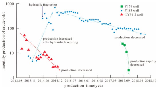 A discrete shale oil reservoir model can better explain the single well development characteristics of lacustrine shale oil reservoirs with low initial production, fast decline, and low recovery. The initial monthly oil production of the Y176 vertical well was 24 t. After four months, the production decreased rapidly to 2 t. LYP1-2 horizontal well had similar results, although the decline in the production was lower. Both showed the production characteristics of fractured reservoirs (Figure 15). Hydraulic fracturing can increase the volume of hydraulic fractures in shale reservoirs, connect natural fractures, increase the contact area between fractures and matrix pores, and help the oil in the matrix pores to enter the fractures, thereby increasing production. For example, the initial monthly production of the Y183 vertical well was 7.4 t; after hydraulic fracturing, the monthly production increased to 249.3 t. After fracturing, shale reservoirs showed characteristics of gradual decline as production proceeded, which is similar to that exhibited by fractured reservoirs. For example, the monthly oil production of the Y183 vertical well decreased to 58.9 t after four years of production.