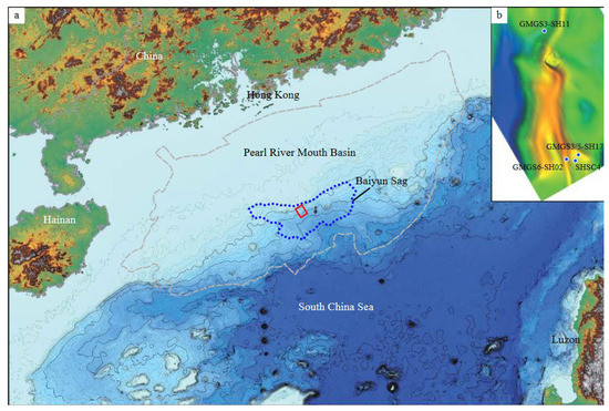 The geological map of the study area. (a)—regional geological background and the location of the study area (marked with a red square); (b)—the relative positions of well GMGS6-SH02 [26].