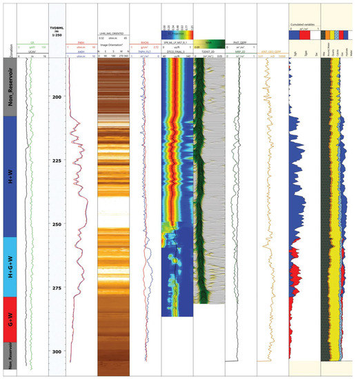 The Chinese second field test site is located in the Shenhu area on the northern slope of the Baiyun Sag in the Pearl River Mouth Basin in the northern South China Sea [26]. The water depth is about 1000~1500 m. In this area, fluid migration has formed many channels, gas chimneys widely developed, and high-angle faults connect with deep source rocks which form fluid migration channels for NGH enrichment and accumulation. As shown in Figure 1, the well GMGS6-SH02 is the pilot hole of the second field test, which is only about 70 m from the trial exploitation target. Qin et al. interpreted and analyzed the geophysical prospecting and drilling data at the well GMGS6-SH02 by various means, and obtained data with high accuracy [27]. Consequently, in this paper, choose the formation condition of the well as the basis for the simulation. The lithology of this well section is dominated by argillaceous silt, and the minerals are mainly divided into argillaceous, sandy, and calcareous, accounting for 47.2%, 36.4%, and 10.2%, respectively. The well can be divided into three layers from top to bottom, namely the NGH-bearing layer (NBL), mixed layer (ML), and free gas layer (FGL), with thicknesses of 45.6 m, 24.6 m, and 19 m, respectively. The average effective permeability is 2.38 mD, 6.63 mD, and 6.8 mD, respectively. Table 2 shows the specific geological parameters of the well. Figure 2 shows the well GMGS6-SH02 logging integrated histogram.
