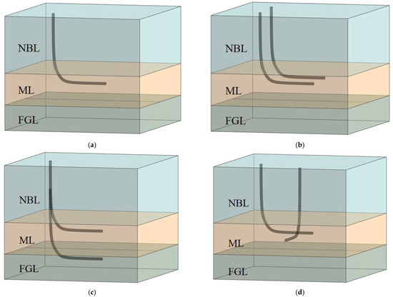 Table 4 shows production parameters for the cases of different well systems and layout options. Figure 3 shows the spatial location distribution of a single horizontal well system and the different layout options of dual horizontal well systems. The single horizontal well (Figure 3a, case 1-1) is located in the center of the model, and the two wells of the dual horizontal well system are, respectively, set up to be horizontally parallel (Figure 3b, case 1-2), up and down parallel (Figure 3c, case 1-3), and up and down cross (Figure 3d, case 1-4). The synergistic effect when the two wells of the dual horizontal well system are located in different NGH layers for exploitation was better revealed by the above case designs. For case 1-2, the horizontal spacing is set to 100 m. For case 1-3, the upper well is located in the center of the NBL, and the lower well is located in the ML and is 30 m from the top surface of the ML. For case 1-4, both two wells are located in the ML, with the upper one 10 m from the top surface of the ML and the lower one 35 m.