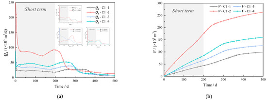In addition, the average Qd of cases 1-2~4 is about 5.3 × 104 m3, 3.2 × 104 m3, and 2.5 × 104 m3, respectively. The average Qd and V of cases 1-2~4 are about 2.67 times, 1.62 times, and 1.27 times that of case 1-1, respectively. The cumulative gas production of the horizontal wells when they are horizontally parallel and exceeded that of a single horizontal well twice, which proves that the synergistic effect can be fully exerted when exploited by using the dual horizontal well system to obtain greater benefits.