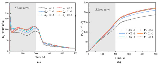 Gas production characteristics for the dual horizontal well system combined with heat injection: (a) Gas production rate; (b) Cumulative gas production.