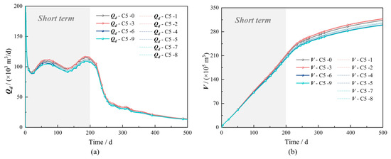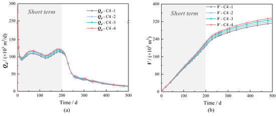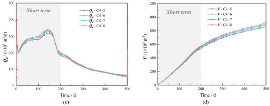 As shown in Figure 6, Qd increases significantly as the production pressure decreases. Meanwhile, the overall trend of the Qd curves of cases 3-1~4 is similar. Qd dropped to the lowest value and rose when exploitation was carried out for about 10~14d. The lower the production pressure, the earlier the rising time will be, and the greater the increase rate. This process will last for about 30 d. Subsequently, Qd entered a stable stage lasting about 150 d. In this stage, Qd does not change much overall, but there will be a trend of first falling and then rising, which is most obvious in case 3-4. Within 50~200 d of exploitation, the gas production is between 26.8 × 104 m3~32.3 × 104 m3, then quickly dropped to 18.8 × 104 m3 and maintain a slow declining trend until the exploitation ended. Although there are still obvious differences in Qd under different production pressures in the middle and late stages of exploitation, none of them can meet the minimum requirements of commercial production. In addition, the V of cases 3-2~4 reaches a maximum of 8.6 × 107 m3. Compared with case 3-1, the V of cases 3-2~4 increased to 1.44 times, 2.02 times, and 2.75 times, respectively. Consequently, for the Shenhu area, short-term exploitation can obtain the greatest benefits. Comparing the V curves of case 3-1 and case 3-4, the cumulative gas production at 110 d of exploitation has exceeded the cumulative gas production of the entire exploitation time (500 d), which again shows that reducing production pressure is an effective way to increase production capacity. Nevertheless, reducing production pressure not only leads to wellbore damage but also causes uncontrollable changes in the surrounding formations. Consequently, in order to achieve the commercial exploitation of NGH by this means, it should not only increase the wellbore strength by various measures but also develop a specific depressurization strategy based on the mechanical properties of NGH reservoirs.