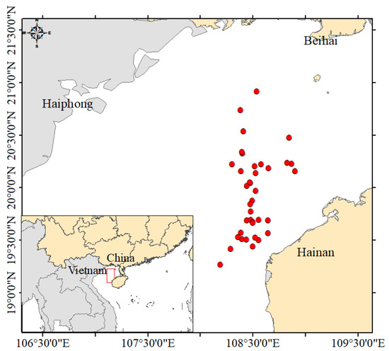 A series of pair trawl fishing experiments was conducted in the fishing grounds of the Beibu Gulf, in the northern South China Sea, from 6 to 18 April 2016. The main fishing areas were located at 19°17′ N–20°45′ N, 108°13′ E–108°55′ E (Figure 1), where the water depth ranged from 42 to 68 m, mainly on a muddy and sandy sea bottom. Fishing times and locations were determined by the captain, aiming to establish a more representative view of the actual situation of commercial trawling in the northern South China Sea.