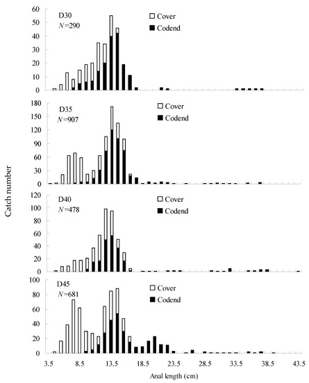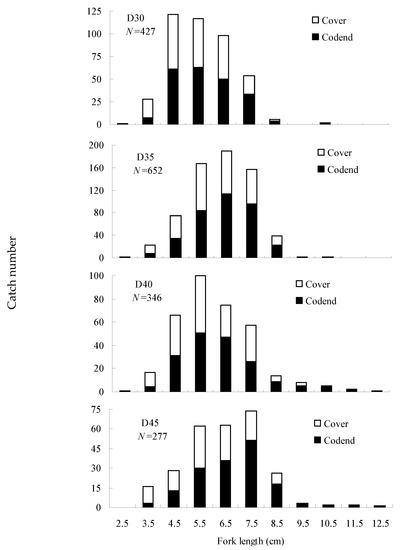A total of 2356 largehead hairtail and 1702 jack mackerel were subsampled and measured. The length distributions of largehead hairtail and jack mackerel of each codend are shown in Figure 2 and Figure 3, respectively. For all codends, the anal length of largehead hairtail ranged from 3.5 cm to 43.5 cm, while in the cover net the distribution ranged from 3.5 cm to 19.5 cm. For jack mackerel, a fork length less than 10.0 cm accounted for 99.06% of the total catch, both in the codends and the cover nets.