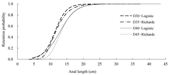 Logistic curves, although symmetric in nature, have been observed to exhibit asymmetry in selectivity curves based on practical studies. This necessitates the adoption of Richards asymmetric curves for a more accurate comparative analysis. The Richards curves were confirmed to be effective to fit fishing data, with a relatively high retention of small fish [18,21]. The situation was almost the same in the present study. The retained number of small largehead hairtail, whose anal length was less than 11 cm, was 266 and 250 for the D35 and D45 codend, compared with only 80 and 113 for the D30 and D40 codend, respectively. Additionally, the Richards curves gave a better fit for the D35 and D45 codend.