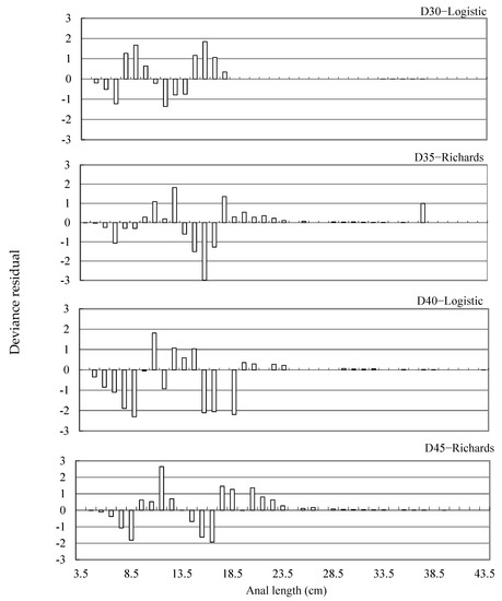Table 2 presents the estimated parameters, their corresponding standard errors, and the results of the hypothesis tests for both the Logistic and Richards curves applied to each codend in the case of the largehead hairtail. The values of L50 and SR for each codend estimated from the Logistic curves were similar to those from the Richards curves. The hypotheses of model fit H0 did not indicate any problems, as all p-values were larger than 0.05. The hypotheses of symmetry H1: δ = 1 were rejected for the D35 codend and D45 codend. Tests indicated that the Richards curves provided a significantly better fit (p-value < 0.05) for the D35 codend and D45 codend, with a major reduction in the model deviances. As a result, we chose the Richards curves for the D35 codend and D45 codend, and the Logistic curves for the D30 codend and D40 codend, as the better fit curves. According to the chosen curves, the L50 of the D30, D35, D40, and D45 codends for largehead hairtail were 11.40, 11.65, 12.92, and 13.28 cm, respectively, while the SR values were 3.81, 3.98, 5.30, and 4.14 cm, respectively. The selectivity curves of each codend for largehead hairtail are shown in Figure 4, and Figure 5 displays the deviance residuals obtained from the best-fit curves for largehead hairtail. The deviance residuals show that the model fits well.