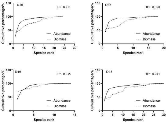 The abundance–biomass comparison (ABC) curve method was proposed by Warwick [23] in 1986 to analyze the characteristics of communities under different disturbance conditions by comparing quantitative dominance curves and biomass dominance curves in the same coordinate system [23,24]. The ABC curve method reflects the theoretical background of the traditional evolution of r selection and k selection. In an undisturbed state, the biomass dominance curve lies above the data dominance curve; when the two curves intersect, it is in a moderately disturbed state; and when the biomass dominance curve is below the number dominance curve, it indicates that the community is in a severely disturbed state [24].