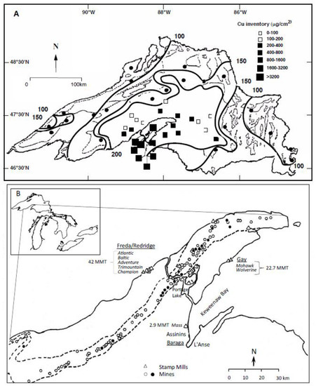 (A) Copper “halo” around the Keweenaw Peninsula of Michigan. The peninsula protrudes into Lake Superior and is surrounded by high sediment inventories of copper. Units of anthropogenic copper inventory in sediments are in µg/cm2 (see scale, upper right). (B) Distribution of copper mines and major shoreline stamp mills along the Keweenaw Peninsula midrib (Portage Volcanics Series). Three major Lake Superior locations (Freda/Redridge, Gay, and Mass Mill) list amounts discharged into coastal environments (MMT, million metric tonnes).