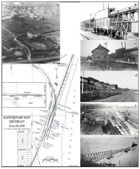 Mass Mill at the “Keweenaw Bay” town location: (a) photo of the town of “Keweenaw Bay” inserted along with a period map (1916), which shows locations of the mill, depot, rail lines, and coal dock; (b) workers in front of the trestle that delivered ore to the top mill level; (c) depot with Mass Mill trestle in the background; (d) Mass Mill descending from the trestle works down to the bay, (e) water tank, carpenter shop, and train tracks leading south to Baraga; (f) elevator track from the Old Coal Dock (all photos courtesy of Baraga County Historical Museum).