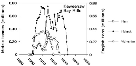 Compared to international operations and other mills along the Keweenaw Peninsula shoreline (Table 1), the amounts released during discharge (1902–1919) were relatively small. Company reports for the Mass Consolidated Mining Company record 2,709,000 tonnes (ca. 2.7 MMT) of ore between 1902 and 1919 (Figure 3), whereas custom work for the Michigan Mill (1902–1906) added another 354 thousand tonnes from the Calico, Branch, and Minesota [sic] lodes, giving a grand total of around 3.1 MMT. Releases occurred in two peaks, interrupted by a district-wide copper miners’ strike in 1913 [17] and trestle repairs. Soon after the strike, the company shipped 1143 tonnes of rock to the mill per day, reaching a maximum of 1800 tonnes of ore hoisted per day as World War I began. Copper concentrate was sent northward to the Quincy Smelter at Ripley or to the Coles Creek Smelter at Houghton, both on the shores of Portage Lake [15]. The Michigan Mine utilized one of the stamp heads at the Mass Mill to process rock (1902–1906), while it constructed what became a nonoperational Mill north of the Mass Mill (1906). By 1911, stamp sand accumulating around the Old Coal Dock was interfering with the water intake crib, and became a nuisance. Mass Consolidated had its peak copper production in 1916. Monthly production from 1916 through 1918 remained between 17,200 to 20,000 tonnes of stamp rock, yielding an average grade of 7.45 kg of copper per tonne of ore. Nearly all the rock mass, at least 2.92 million tonnes of stamp sands, left the mill as tailings deposited into Keweenaw Bay.