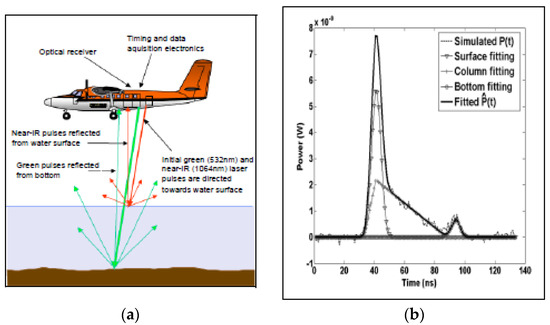 For LiDAR, two laser pulses (blue-green 532 nm and near-IR 1064 nm) sweep across the lake surface: (a) The near-IR reflects off the water surface, whereas the blue-green penetrates through the water column and reflects off the lakebed. The difference between the two returning pulses gives the depth of the water column and details of bathymetry (modified from LeRocque and West [21]); (b) Simulated LiDAR waveform fitted with Gaussian function (water surface peak), a triangle function (water column reflectance), and a Weibull function for bottom reflectance (after Abdallah et al. [22]).