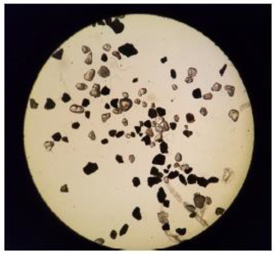 Sample of sand grains from Sand Point (ca. 55% stamp sands) under transmitted light from a microscope, showing the contrast between rounded natural sand (transparent quartz) and dark stamp sand grains (dark, irregular, slightly larger).