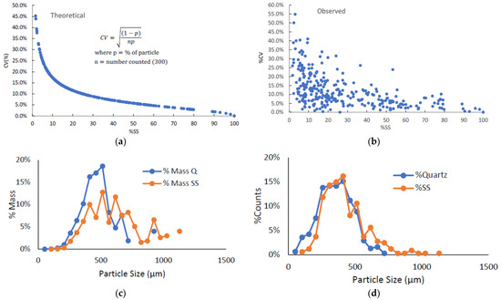 In a mixed sand sample, grain counts (natural sand, stamp sand) follow a binomial distribution: (a) the coefficient of variation for the % stamp sand calculation is known (see equation under “Theoretical”); (b) field counts closely correspond to the expected values (“Observed”). For particle sizes, see comparison of (c) % particle counts and (d) % particle mass from the Sand Point beach sample. Particle sizes are similar, but notice the slightly larger sizes and mass for stamp sands (SS) compared with natural quartz (Q) sands in the mixed sand sample.
