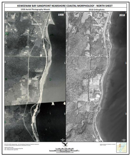 Side-by-side aerial photos in Figure 7 (North Sheet) compare a 1938 image of the coastline with a modern-day 2018 image. The coastline stretches from the Mass Mill location on the north to Assinins. The Mass Mill stamp sand discharges were an 18-year (1902–1919) massive point release of particles with two fractions. The fine fraction (slime clay; 10–17% of mass; [32,33]) dispersed widely and rapidly, whereas dispersal of the coarse fraction (sand; 83–90% of mass) was slower and followed the path of natural shoreline sand erosion, migrating down to and adding onto Sand Point [18]. On the 1938 aerial image, we see scattered houses around the former town of “Keweenaw Bay Community”, a working railway, several small roads, and a minor highway (M-15). A large triangular wedge of stamp sand lies against the northern side of the “Old Coal Dock”. The coal dock stamp sand beach diminished with time, leaving only a slight bulge in 2018. By 1938, the stamp sands have migrated halfway down to Sand Point as an extensive grey beach with a width of 50–100 m and are near Assinins (Figure 7).