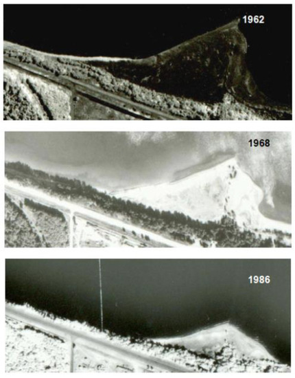 Tailings accumulated around the Mass Mill Coal Dock during operations (1901–1919). Tailings eventually interfered with water intake operations, causing suspension of the “Coal Dock” operations. Subsequent erosion of this remnant mass is caught by aerial images (1962, 1968, and 1986). For an interval, the stamp sands were so pervasive, they protected the shoreline from erosion (Vitton & Williams [38]). The Coal Dock cribbing still reaches out into Lake Superior at right angles to the shoreline and remains a nautical hazard. The main Highway is U.S. 41. Notice how the northern bluff cliff edge eroded closer to the highway through time (compare 1960s to 1986), resulting in a slight relocation (in 2010, 30 m) of the highway.