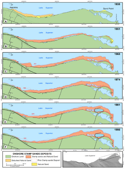 Migration of stamp sand southward along the coast from Assinins to Sand Point (A–F: 1938–1998). Yellow represents natural sand beach; orange is a mixed (stamp sand/natural grains) beach; whereas reddish indicates a largely stamp sand beach. The various panels also show the progressive transformation of the coastline and Sand Point to a mixed wetland and multiple pond environment.