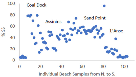After discharge, tailing particles (stamp sands) readily mixed with shoreline natural sands (quartz grains) that eroded from Jacobsville Sandstone bedrock and glacial till. Yet, the two end members (basalt stamp sands; natural quartz grains) were readily distinguishable (Figure 5). First of all, recording the percentage of stamp sand in sand mixtures (Supplementary Materials Tables S1 and S2) is an important variable, as it tells us where sand-sized tailings dispersed. Secondly, if there is no differential sorting of particles, the percentage of stamp sand allows for a preliminary prediction of sediment copper concentrations, important for determining potential environmental effects. The high percentage stamp sand samples from the Mass Mill location allow an initial concentration of Cu in discharged tailings (ca. 0.28–0.30% Cu). However, there were multiple ore bodies processed at the Mass Mill. Because we could not determine a single original discharge pile at the Mass Mill site, we favored using an 8-pile mean from other sites (8 amygdaloid stamp sand piles average of 0.3% Cu or ca. 3000 µg/g or ppm; a fairly similar value; [18]). Using the 0.3% Cu value and the percentage stamp sand values at various sites, a simple multiplication allows a prediction of copper concentrations for beach sand and underwater sediments (e.g., % SS × 3000 ppm Cu). However, this simple calculation assumes that copper particles are randomly distributed, not subject to particle sorting by wave action, i.e., particle size or density. Two concerns were that more dense particles with higher Cu concentrations might remain near the original discharge site and that waves might winnow out clay-sized particles (known to contain slightly higher Cu concentrations; [31]).
