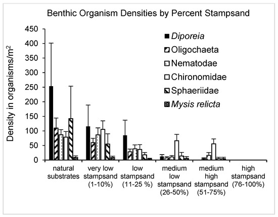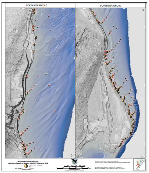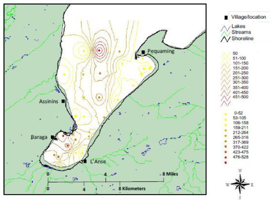 Many of the measured copper concentrations represent toxic conditions for sediment organisms. The sediment copper concentration at which sensitive organisms first show toxicity, the threshold effects level (TEL or TEC), ranging from 16 to 70 μg/g, and the concentration at which biotic effects are probable (PEL or PEC) ranges from 36 to 390 μg/g [40,41]. Figure 15 indicates that locations with more than 30–40% stamp sands are likely to experience toxic conditions for sediment biota. As illustrated earlier, a narrow strip along the coastline from the Mass Mill site to Sand Point would definitely experience such toxic effects. However, unlike marine systems, the Great Lakes have no intertidal zone with enriched abundance or diversity of organisms. Juvenile fish and benthic macroinvertebrates generally are in maximum abundance at water depths of 30–100 m in Lake Superior [42,43,44]. Because the depth of the highest benthic invertebrate biomass varies with wind fetch, there is a need to map invertebrate densities and juvenile fish abundance in the lower regions of Keweenaw Bay. Mapping of benthic diversity and seining of YOY fish along Grand Traverse Bay (Buffalo Reef, Gay) shorelines have demonstrated severe depression of both groups where stamp sand concentrations are high [36,37]. This will be reviewed in more detail in the Discussion.