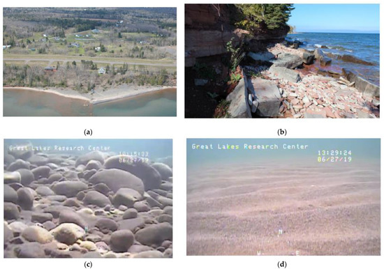 Recent views of the former Mass Mill and northern coastline sites. (a) A sandstone cobble beach is developing along the shoreline and around the remaining triangular wedge of residual stamp sands at the base of the Coal Dock. Cribwork for the Coal Dock still protrudes out into Keweenaw Bay. The original mill, town, train station, and railroad complex are absent, only a remodeled Assay (Laboratory) House and a few scattered new homes remain. Highway #41 runs over ground once occupied by the extensive railroad tracks and trestles. (b) Sandstone block and cobble shoreline south of Mass Mill. The site includes a mixture of natural sandstone pebbles, cobbles, and capstone boulders eroding from the 5′ Jacobsville Sandstone shoreline edge. The beach width was once covered by hundreds of feet of stamp sand during mill discharge, but is now in recovery. (c) ROV photo of extensive underwater large cobble and boulder fields on the shelf region off the Mass Mill site. The rounded cobble and boulder beds are sites where fish drop eggs. (d) Off Assinins, ROV photos of massive migrating sand bars show pronounced ripples. Offshore there is little stamp sand in the moving bars, often less than 20–10% of particles. The sand surface appears a grainy, mottled light pink.