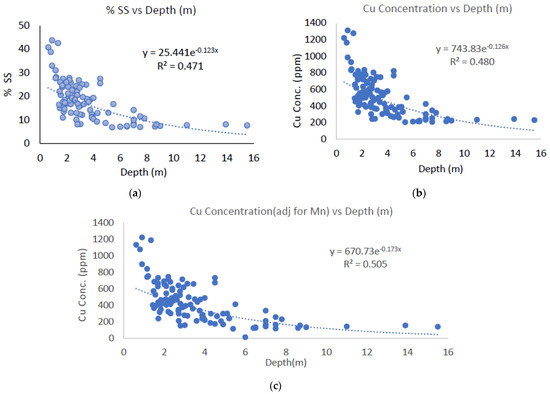Stamp Sand percentages and predicted Cu concentrations plotted against water depth across the Assinins Shelf (exponential regression fits). (a) Stamp Sand percentages determined by microscopic counting technique; (b) Cu concentrations predicted assuming the mean concentration of 0.3% copper in stamp sand; (c) Cu concentrations corrected for Mn (see Supplementary Materials Table S4). These diagrams are underwater values and do not include shoreline stamp sand beach deposits.