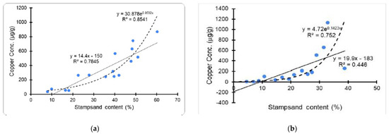 Relationship between directly determined copper concentrations and stamp sand content for sediment grab samples: (a) These samples were collected in 2019 from the northern Keweenaw Bay area (Gay) by Buffalo Reef; (b) These samples were collected in 2019 from lower Traverse Bay and Sand Point.