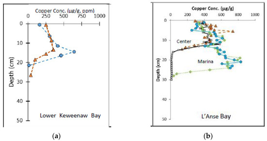 Directly determined copper profiles from sediment cores: (a) two cores from the southern region of Keweenaw Bay; (b) profiles from four L’Anse Bay cores, two off the Marina and two from the center of the bay. All core profiles have a buried maximum. Surface concentrations from both regions have decreased substantially since the historical maximum peak, yet remain elevated far above background (~35 mg/kg; ppm) at all locations.