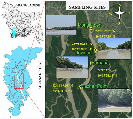 The Pasur River is considered the largest and most vital river in the Sundarban estuarine region that is located in the southwestern (Figure 1) portion of Bangladesh. This river has a length of 142 km with a depth range of 3 to 15 m. It is a tidal river with an approximate tidal area ranging between 1.5–3.0 m [20]. Sampling was conducted at four sites namely Mongla Ferry Ghat (22°27′59.79″ N, 89°35′37.35″ E), Joymoni (22°91′09.63″ N, 89°37′20.13″ E), Harbaria (22°17′47.91″ N, 89°35′54.48″ E) and Mazhar Point (22°11′09.10″ N, 89°32′33.30″ E). Mongla is regarded as Bangladesh’s second-largest seaport and is surrounded by numerous industries. Rapid industrialization, heavy transport systems, municipal wastewater, domestic sewage, etc. are the major source of pollution at this sampling site. Joymoni is the southwest end of Mongla Upazila (sub-district) and is situated west of Kumarkhali Khal and east of Khulna Reserved Forest. It is approximately 17.5 km away from Mongla. This site is less polluted than Mongla. Salinity concentration is higher and tidal movement is more prevalent. Harbaria is located in the Chadpai range of the Sundarbans beside the Pasur River on the North side of the Bay Bengal. This site is approximately 8 km away from Joymoni and is characterized by a landing zone of numerous large shipping vessels, mechanized river crafts, and fishing boats passing through the Sundarbans. These vessels release waste oil, spillage, ballast water, garbage, and bilge washings. Mazhar Point is approximately 12.4 km away from Harbaria and comparatively less affected by industrial effluents. The salinity of water in Mazhar Point is higher than the other three sites.