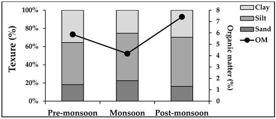 Water temperature, transparency, salinity, alkalinity, and TDS were significantly higher during the pre-monsoon season, while pH, DO, NO3-N, and PO4-P were significantly higher during the post-monsoon season (Table 1). Two-way ANOVA conducted in water and sediment quality parameters showed significant seasonal variation, while did not show significant spatial variation for all the parameters (Table S1). The minimum temperature in post-monsoon might be occurred as a consequence of lower air temperature, whereas the maximum temperature in pre-monsoon might be caused by higher solar radiation. The results of the current study on water temperature were more or less identical to those of Kosari et al. [44] and Shefat [45] as they also recorded the highest temperature in pre-monsoon and lowest in post-monsoon from Yekshabe creek-estuary, Persian Gulf and Pasur River estuary, respectively. Significantly (p < 0.01) higher transparency was also recorded during the pre-monsoon season which supports the findings of Nabi et al. [46], Akther et al. [47], and Abu Hena et al. [48]. In the present study, maximum salinity was recorded in the pre-monsoon (18.72 ppt) season and might be caused by decreased river discharge from upstream freshwater sources and a higher rate of evaporation, whereas the minimum was recorded in the monsoon (5.18 ppt) season as rainfall and water currents during floods reduce salinity which supports the findings of Rahman et al. [49]. The water pH of the Pasur River estuary was found to fluctuate from 7.12 to 7.98 which indicates the alkaline nature of the water. The elimination of CO2 by photosynthesis through bicarbonate degradation, a decrease in salinity and temperature, dilution of seawater by the influx of freshwater, and the decomposition of organic waste may all contribute to higher pH values in post-monsoon seasons. Similar findings were also reported by Chowdhury [50] and Matin et al. [14]. DO was the highest during pre-monsoon and the lowest during post-monsoon season. Higher temperature and the presence of oxygen-demanding municipal and industrial effluents might be responsible for the lower DO during the pre-monsoon season and lower water temperature might be responsible for higher DO during post-monsoon. A study conducted by Shefat [45] reported the range of DO was 5.97 to 8.43 mg/L in the Pasur River estuary which is supported by the present findings. Significantly higher alkalinity and total dissolved solids (TDS) were recorded during the pre-monsoon season might be due to the increased ionic concentration of water at higher temperatures which are supported by the findings of Nabi et al. [46], Akther et al. [47] and Abu Hena et al. [48]. Rainfall and upstream water flow were found to regulate the nutrient content of the Pasur River estuary. The monsoon season had a dilution effect on NO3-N and PO4-P concentration and therefore, lower level of nutrients was recorded during monsoon season. On the contrary, post-monsoonal deposition of municipal and domestic sewage water, decaying plant debris, and reduced freshwater flow were found to increase the nutrient content of water. The monsoonal effect on the nutrient content of water was also previously reported by Rahaman et al. [49], whereas they recorded lower nutrients from water during monsoon season. The percentage composition of sand was higher in monsoon (Figure 2) following the pre-monsoon and post-monsoon. In contrast to clay and sand, silt particles predominated in the research area. Silt and clay content were higher during the post-monsoon and pre-monsoon seasons, but lower content of these particles were observed during the pre-monsoon and monsoon seasons, respectively. Furthermore, the highest percentage composition of organic matter occurred in post-monsoon and lower in the monsoon season, consequently.