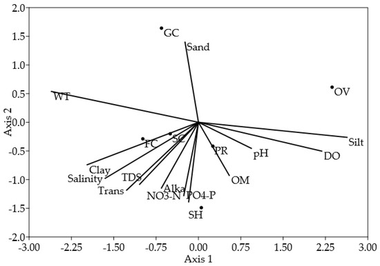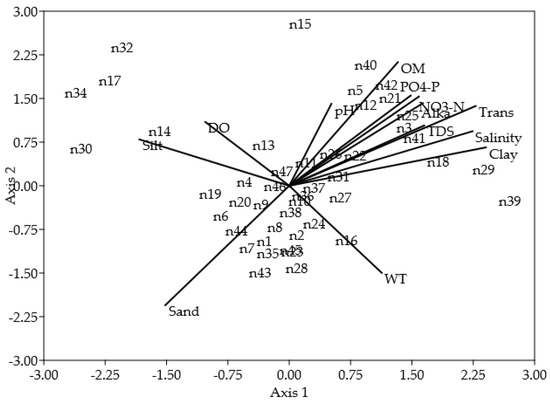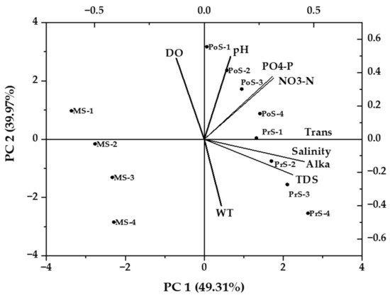 PCA biplot of the environmental parameters is shown in (Figure 3). In the principle components analysis, PCA 1 and PCA 2 explained 49.31% and 39.97% variability of the data respectively, thus accounting for 89.28% of the total variability. The first principle component axis (PCA 1) discriminated the pre-monsoon samples mainly based on salinity, transparency, and TDS while the second axis (PCA 2) described the post-monsoon samples as per pH, DO, NO3-N, and PO4-P. However, a negative correlation of water temperature was observed with a post-monsoon sample. The present findings roughly support the findings of Shabani et al. [37] who reported that temperature, turbidity, pH, conductivity, ammonia-nitrogen, NO3-N, and total phosphorus influence macro-benthic sample and also observed a positive significant relationship exist between NO3-N and pH.
