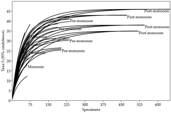 Species accumulation curve (method = rarefaction) showing differences in the total number of species per individual sample for three seasons. An individual’s number is displayed by green, red, and purple lines for pre-monsoon, monsoon, and post-monsoon, respectively.